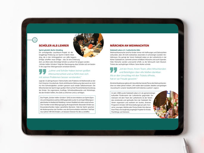 Die digitale Jubiläumsbroschüre der JABE Stiftung zum 10-jährigen Bestehen stellte eine besondere Herausforderung dar, da viele Projekte, Zahlen und Berichte in einer abwechslungsreichen, ansprechenden Gestaltung präsentiert werden sollten.